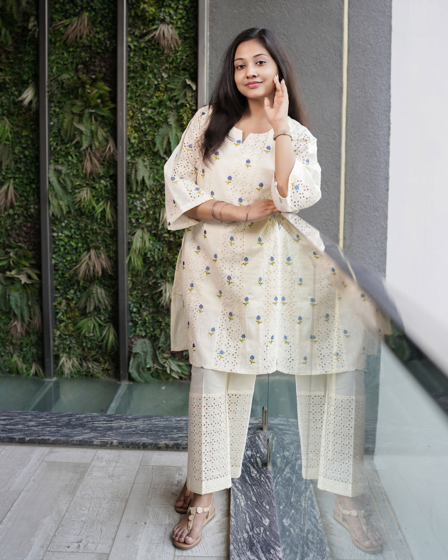 Elevate your ethnic wardrobe with this elegant off-white cotton chikan embroidered co-ord set. Crafted from breathable pure cotton, this ensemble features intricate chikankari work paired with delicate floral embroidery in subtle hues of blue and green. The kurta comes with elbow-length flared sleeves and a straight-cut silhouette, offering both comfort and grace. Paired with eyelet-detailed straight pants, the look is perfect for casual outings, festive get-togethers, or office wear. Light, breezy, and beautifully detailed—this set is your go-to for effortless elegance.