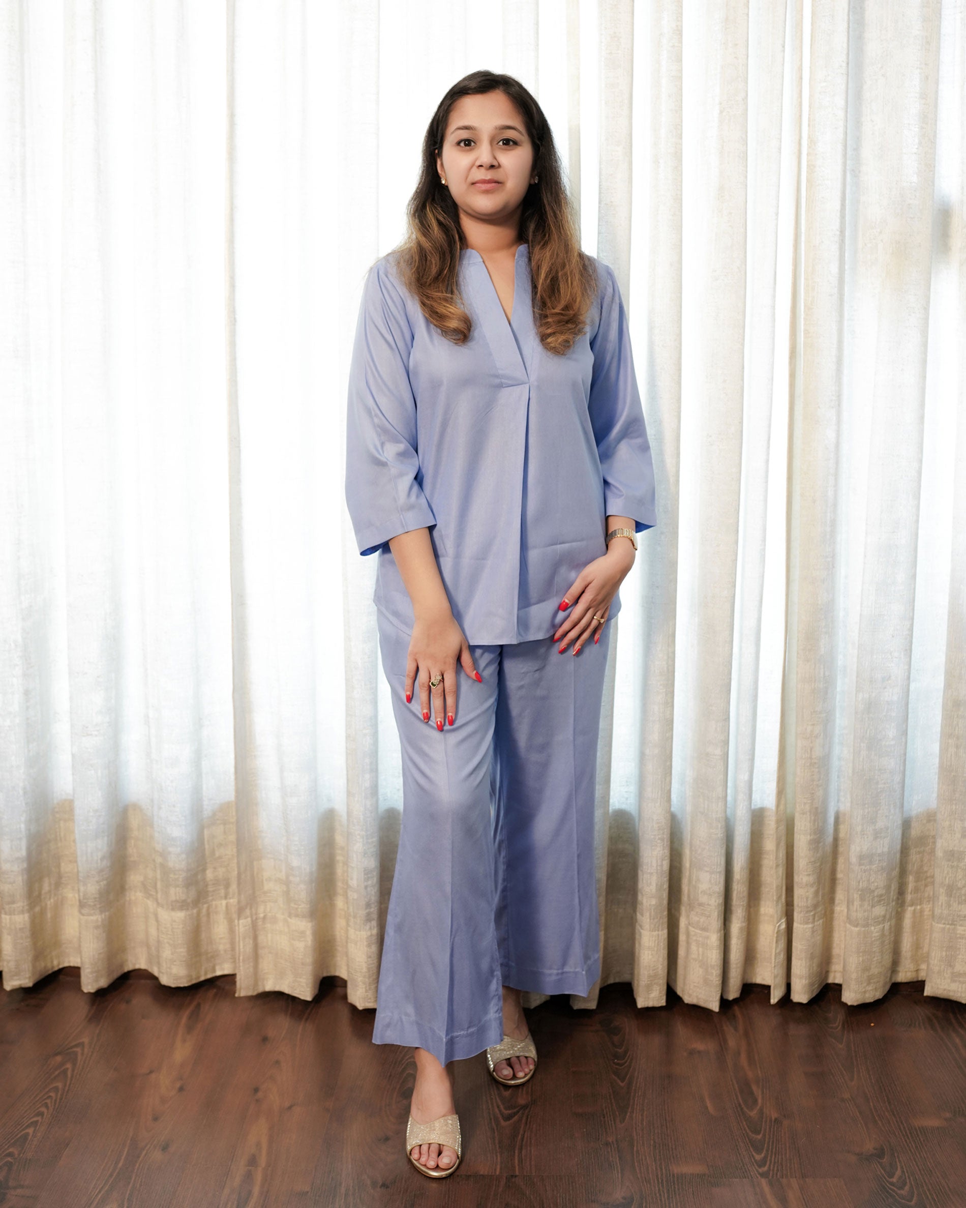 Step into effortless elegance with this pastel Powder Blue co-ord set, designed for the modern woman who values both comfort and style. Crafted from a soft, breathable fabric with a subtle sheen, this ensemble features a relaxed-fit top with a deep V-slit neckline and three-quarter sleeves. The matching wide-leg trousers offer a flattering silhouette, perfect for all-day wear. Whether you're heading to brunch, a casual meeting, or a relaxed evening out, this co-ord set blends simplicity and sophistication effortlessly